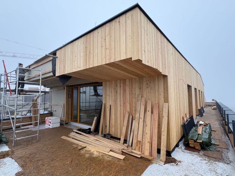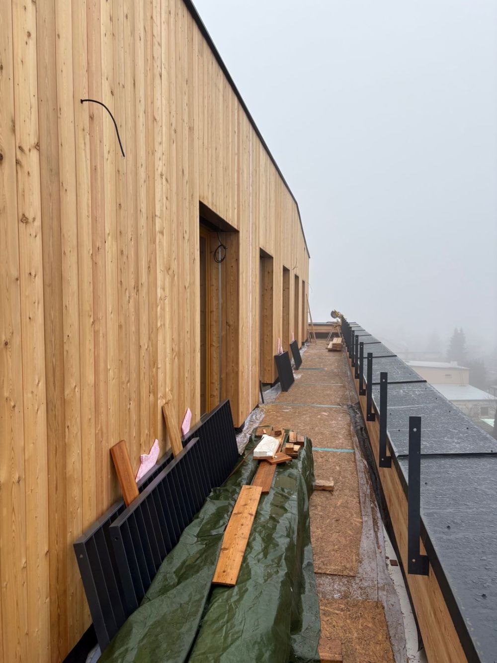 Velký pokrok jsme zaznamenali v oblasti technického vybavení a infrastruktury. Výtah v budově je již plně dokončen a uveden do provozu, což výrazně usnadňuje logistiku posledních fází stavby. Aktuálně se naše úsilí soustředí na vystrojení domovní kotelny a realizaci přípojek plynu a elektrické energie, které jsou klíčové pro zajištění budoucího provozu. Výraznou vizuální proměnou prochází také exteriér, kde již téměř dokončujeme realizaci dřevěného obkladu fasády u největšího bytu v objektu. Tento přírodní prvek podtrhuje prémiový charakter bydlení, který je pro Rezidenci Zdaboř typický.